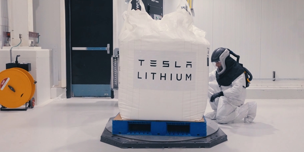 ▲ 방호복을 입은 노동자가 미국 텍사스주 코퍼스크리스티 인근에 위치한 테슬라 리튬 제련 공장에서 '테슬라 리튬'이라고 적인 포대를 점검하고 있다. <테슬라 유튜브 영상 갈무리>