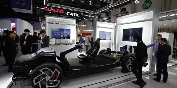 ▲ 관람객 1월13일 아랍에미리트 아부다비에서 열린 미래에너지정상회의(WFES) 전시장에서 중국 CATL의 배터리 모형을 살펴보고 있다. <연합뉴스>
