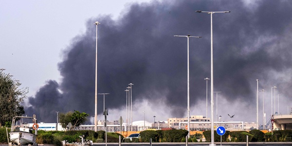 ▲ 3월1일(현지시각) 이란의 미사일 공격이 벌어진 아랍에미리트 아부다비에서 연기가 솟아오르고 있다. <연합뉴스>