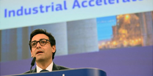 ▲ 스테판 세주르네 유럽연합(EU) 집행위원이 4일(현지시간) 브뤼셀 EU 집행위원회 본부에서 열린 기자회견에서 '산업 가속화법안(IAA)'에 대해 발표하고 있다. <연합뉴스 >