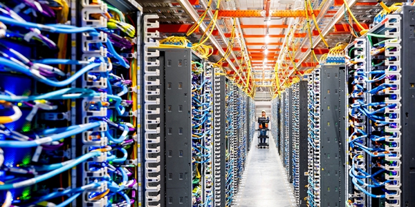 ▲ 작업자가 2025년 10월2일 미국 인디애나주 뉴칼라일에 위치한 아마존웹서비스 데이터센터 내부에서 물건을 옮기고 있다. <연합뉴스>
